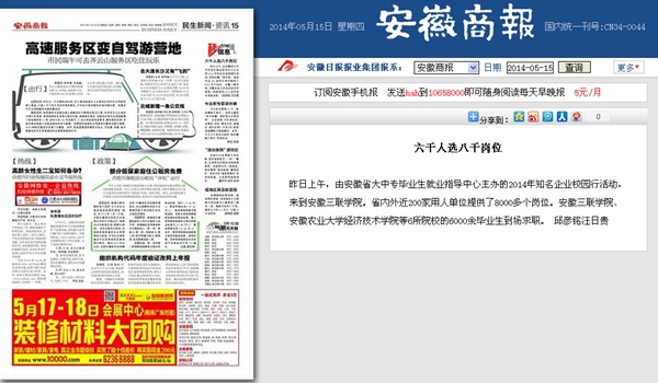 5月15日,安徽日報、安徽商報分別以“促進高校畢業(yè)生就業(yè)創(chuàng)業(yè),名企招聘進校園”、“六千人選八千崗位”為題圖文并茂報道我院2014年知名企業(yè)校園行活動,在省內反響熱烈。(撰稿、編輯:韓燎原)