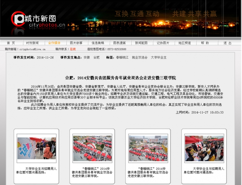 2014年11月26日,由共青團(tuán)安徽省委、安徽省教育廳、安徽省人社廳、安徽省青年企業(yè)家協(xié)會(huì)聯(lián)合主辦,安徽三聯(lián)學(xué)院、新安人才網(wǎng)承辦的“春暖皖江”安徽共青團(tuán)服務(wù)青年就業(yè)雙選會(huì)走進(jìn)安徽三聯(lián)學(xué)院。為更好地培育應(yīng)用型人才,服務(wù)地方社會(huì)經(jīng)濟(jì)發(fā)展,經(jīng)過(guò)學(xué)校前期認(rèn)真調(diào)研精選出的安徽省內(nèi)外150多家用人單位為大學(xué)生提供7000多個(gè)就業(yè)崗位。招聘專業(yè)涉及該院交通運(yùn)輸、交通工程、電氣工程及其自動(dòng)化、市場(chǎng)營(yíng)銷、交通安全與智能控制、計(jì)算機(jī)應(yīng)用技術(shù)和應(yīng)用日語(yǔ)等30個(gè)全部本科專業(yè)。該院及安徽農(nóng)業(yè)大學(xué)經(jīng)濟(jì)技術(shù)學(xué)院、合肥財(cái)經(jīng)職業(yè)技術(shù)學(xué)院等周邊6所院校的6000余名畢業(yè)生到場(chǎng)求職。