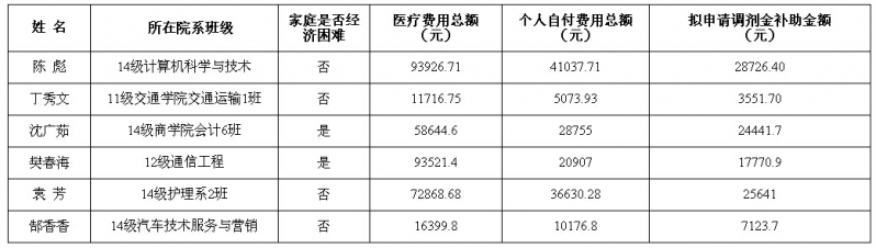 為切實(shí)保障和提高參保大學(xué)生醫(yī)療保險(xiǎn)待遇,按照大學(xué)生基本醫(yī)療保險(xiǎn)相關(guān)政策,在學(xué)校領(lǐng)導(dǎo)和各相關(guān)部門的關(guān)心支持下,我校2014年第四季度在校大學(xué)生基本醫(yī)療保險(xiǎn)省級(jí)調(diào)劑金個(gè)人申報(bào)工作近日結(jié)束。對(duì)于參保學(xué)生提出的調(diào)劑金補(bǔ)助申請(qǐng),經(jīng)審核,現(xiàn)將擬上報(bào)同學(xué)情況公示如下: