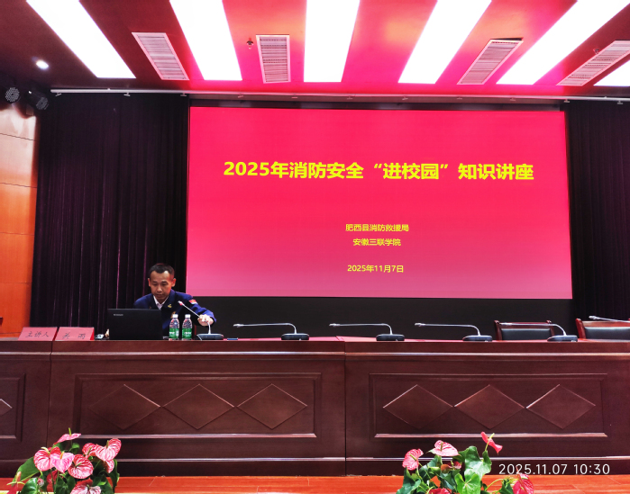 為切實提升師生消防安全意識和自防自救能力,進(jìn)一步明確消防安全責(zé)任,強(qiáng)化消防安全風(fēng)險防范,11月7日上午,學(xué)校邀請肥西縣消防救援局專業(yè)技術(shù)干部關(guān)雨來校開展2025年消防安全“進(jìn)校園”知識專題講座。三院三部學(xué)管主任、輔導(dǎo)員,安全管理處相關(guān)人員及三百余名學(xué)生參加活動。