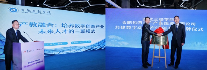 當(dāng)日下午,由安徽三聯(lián)學(xué)院參與主辦的2025紫云山數(shù)字創(chuàng)意產(chǎn)學(xué)研交流會(論壇)在紫云山文化創(chuàng)意產(chǎn)業(yè)園成功召開。潘濤作《產(chǎn)教融合:培養(yǎng)數(shù)字創(chuàng)意產(chǎn)業(yè)未來人才的三聯(lián)模式》主題報(bào)告,系統(tǒng)介紹了學(xué)校在校企協(xié)同、項(xiàng)目驅(qū)動、工作室制等方面的探索與成效。會上,安徽三聯(lián)學(xué)院與合肥包河文廣產(chǎn)業(yè)投資有限公司為校企共建的“數(shù)字動漫產(chǎn)學(xué)研基地”揭牌。