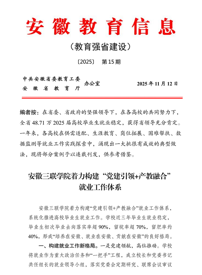 近日,我?!包h建引領(lǐng)+產(chǎn)教融合”就業(yè)工作案例在《安徽教育信息(教育強省建設(shè))》2025年第15期刊發(fā)。作為扎根安徽的首所民辦高校,學(xué)校立足區(qū)域發(fā)展需求,破解就業(yè)結(jié)構(gòu)性矛盾,走出了一條具有民辦特色的就業(yè)育人新路徑。