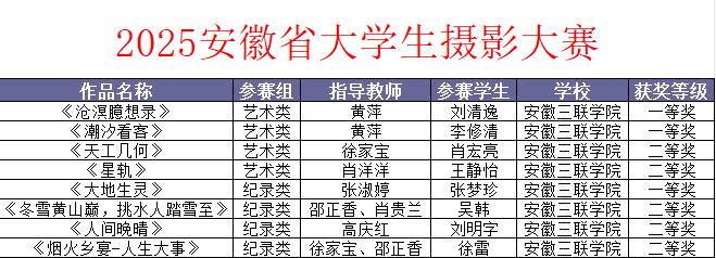 在2025年安徽省大學(xué)生攝影作品大賽中,作品《滄浪隨想錄》、《潮汐看客》、《大地生靈》榮獲一等獎,《天工幾何》等作品獲得二等獎。