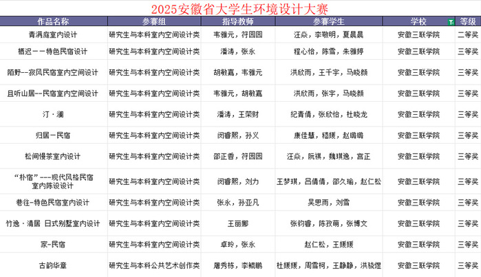 在2025年安徽省大學(xué)生環(huán)境設(shè)計大賽中。作品《青滿庭室內(nèi)設(shè)計》榮獲室內(nèi)空間設(shè)計類二等獎;《松間慢茶室內(nèi)設(shè)計》等10項作品榮獲三等獎。
