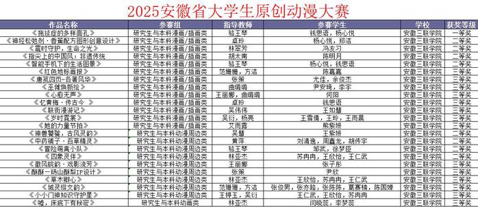 在2025年安徽省大學(xué)生原創(chuàng)動漫大賽中,作品《拖延癥的多樣面孔》榮獲漫畫/插畫類一等獎;《中藥鋪子·百草精靈》、《徽風(fēng)皖韻·戲影流芳》等作品分獲各品類二、三等獎。