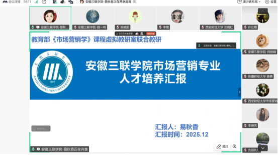 12月21日,我校市場營銷專業(yè)與西安財經(jīng)大學(xué)商學(xué)院市場營銷系、新疆財經(jīng)大學(xué)工商管理學(xué)院(MBA學(xué)院)營銷與商務(wù)分析系共同舉辦以“市場營銷專業(yè)人才培養(yǎng)”為主題的線上教學(xué)研討活動。本次研討依托教育部《市場營銷學(xué)》課程虛擬教研室平臺,聚焦數(shù)智營銷人才培養(yǎng),就專業(yè)課程設(shè)置、實踐教學(xué)及跨校合作等方面展開深入探討,市場營銷全體教師在線參與研討。