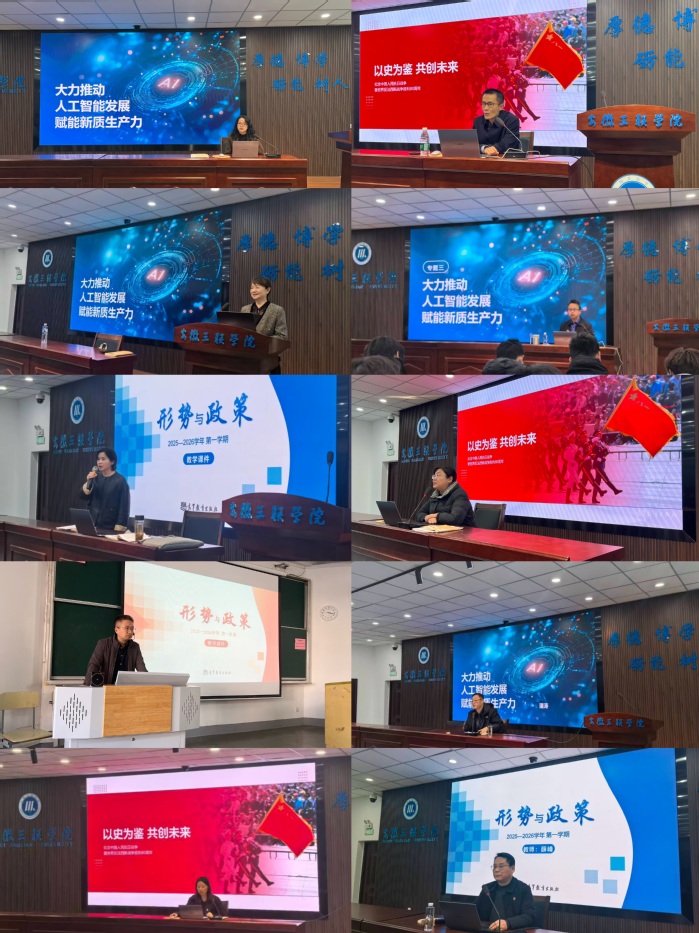 在“講”的環(huán)節(jié),校領(lǐng)導(dǎo)率先垂范,走上思政課講臺(tái)。王光虎圍繞“愛(ài)國(guó)、奮斗、本領(lǐng)、紀(jì)律”等關(guān)鍵詞,為2025級(jí)6000余名新生講授第一堂思政課,勉勵(lì)學(xué)生筑牢信仰根基,立志成才報(bào)國(guó)。校領(lǐng)導(dǎo)江秀麗、趙翀、洪梅、操曉峰、蔡文芬、宋夢(mèng)嵐、傅煒、潘濤、范兆紅、薛峰等,分別結(jié)合國(guó)家發(fā)展大勢(shì)與學(xué)科專業(yè)背景,聚焦“學(xué)習(xí)貫徹黨的二十屆四中全會(huì)精神”“人工智能時(shí)代的機(jī)遇與挑戰(zhàn)”“教育強(qiáng)國(guó)建設(shè)的歷史使命”“銘記抗戰(zhàn)歷史、弘揚(yáng)愛(ài)國(guó)精神”等主題,面向各院部學(xué)生講授“形勢(shì)與政策”課。課程內(nèi)容緊密聯(lián)系理論與實(shí)踐,深度回應(yīng)學(xué)生關(guān)切,有效拓展了思政課的教學(xué)廣度與思想深度。