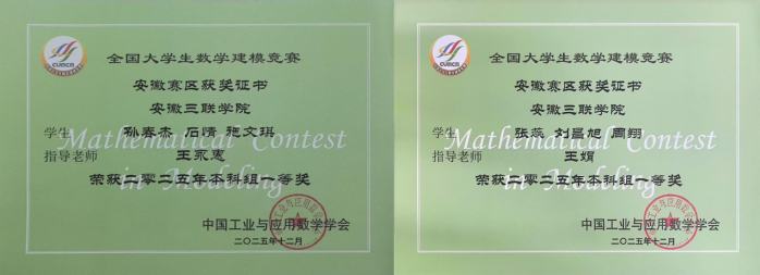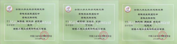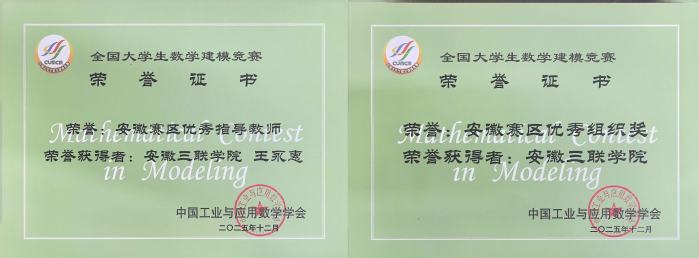 近日,2025年“高教社杯”全國大學生數(shù)學建模競賽成績揭曉。我校學子在比賽中奮力拼搏、勇于創(chuàng)新,在賽事中表現(xiàn)優(yōu)異,共榮獲安徽賽區(qū)本科組一等獎2項、二等獎5項、三等獎14項,安徽三聯(lián)學院獲“安徽賽區(qū)優(yōu)秀組織獎”。