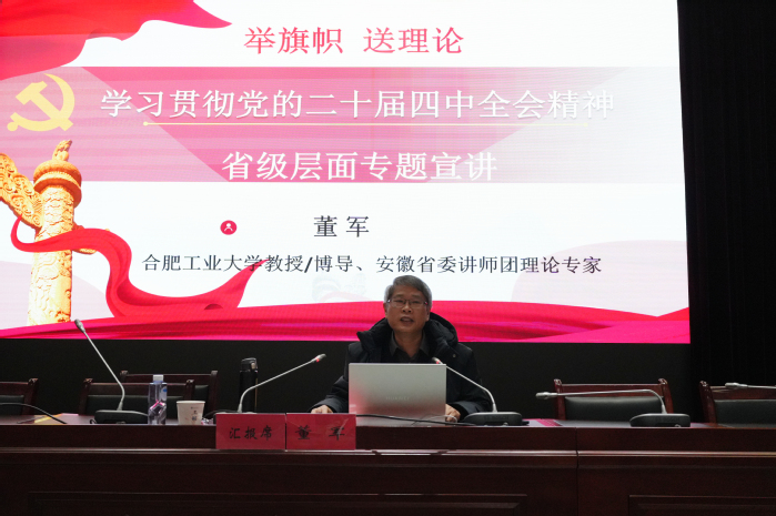 1月9日下午,學校在圖書館學術(shù)報告廳開展“舉旗幟 送理論”學習貫徹黨的二十屆四中全會精神省級層面專題宣講會。省委講師團理論宣講專家?guī)斐蓡T、合肥工業(yè)大學馬克思主義學院教授董軍受邀作專題輔導(dǎo)報告,學校黨委委員、副校長蔡文芬主持會議。