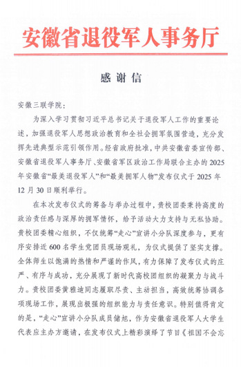 近日,安徽三聯(lián)學(xué)院收到安徽省退役軍人事務(wù)廳發(fā)來(lái)的感謝信,信中對(duì)學(xué)校在2025年安徽省“最美退役軍人”和“最美擁軍人物”發(fā)布儀式中給予的大力支持、作出的突出貢獻(xiàn)給予高度贊譽(yù),對(duì)參與活動(dòng)的師生團(tuán)隊(duì)致以崇高敬意。這封沉甸甸的感謝信,既是對(duì)學(xué)校擁軍工作與育人成效的充分肯定,更是對(duì)全體三聯(lián)人傳承紅色基因、厚植擁軍情懷的莫大鼓舞。